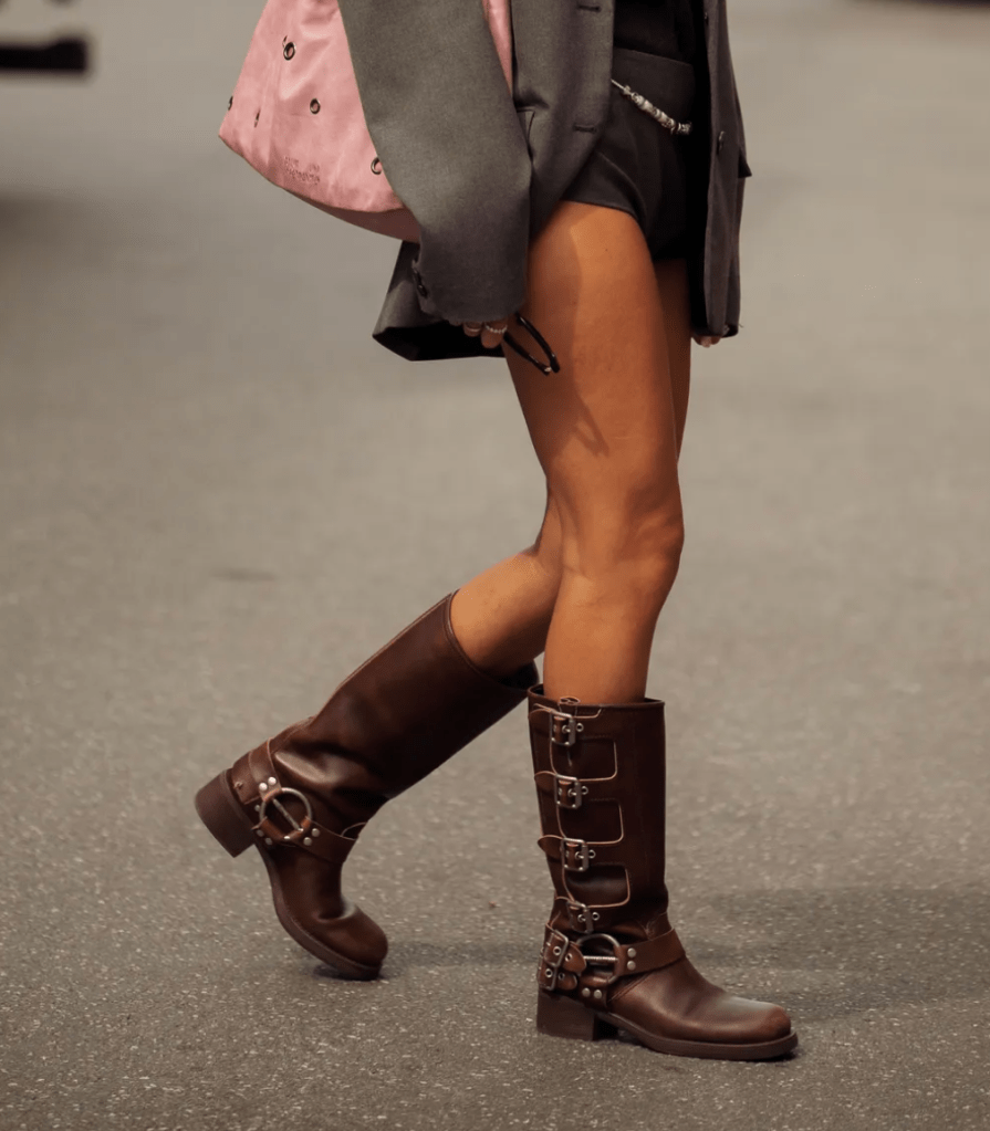 2. Moto Boots: Tall boots are enjoying a stand-out year. Zendaya was recently spotted wearing Frye’s iconic campus boots, which perfectly capture the tall, structured silhouette that is gaining popularity. Buckles, straps, and moto accents are also having a moment—these hardware details add a bold touch, especially when paired with feminine pieces like bubble dresses and miniskirts.