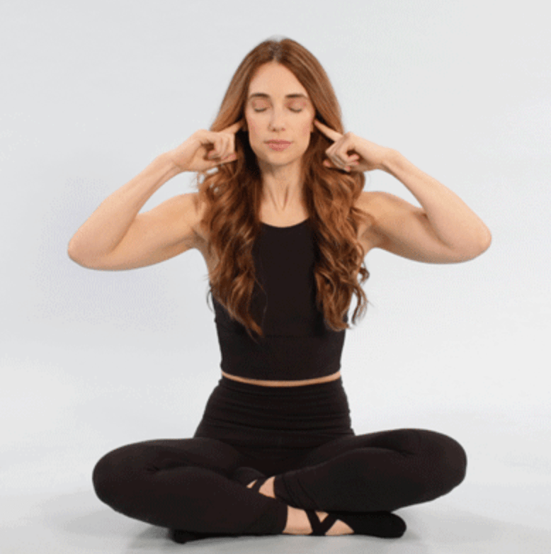 Choose a seated position and close your eyes. Place your first fingers on the tragus cartilage which partially covers your ear canal. Inhale and gently press your fingers into the cartilage as you exhale. Keeping your mouth closed, make a humming sound. Continue for as long as possible.